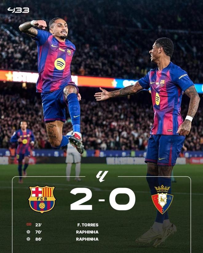 西甲第16轮,巴萨主场2-0奥萨苏纳,各项赛事5连胜,先赛7分领跑。费兰破门无效+倒钩造险,拉什福德禁区倒地未判罚,佩德里助攻拉菲尼亚远射打破僵局,随后拉菲尼亚推射完成双响。